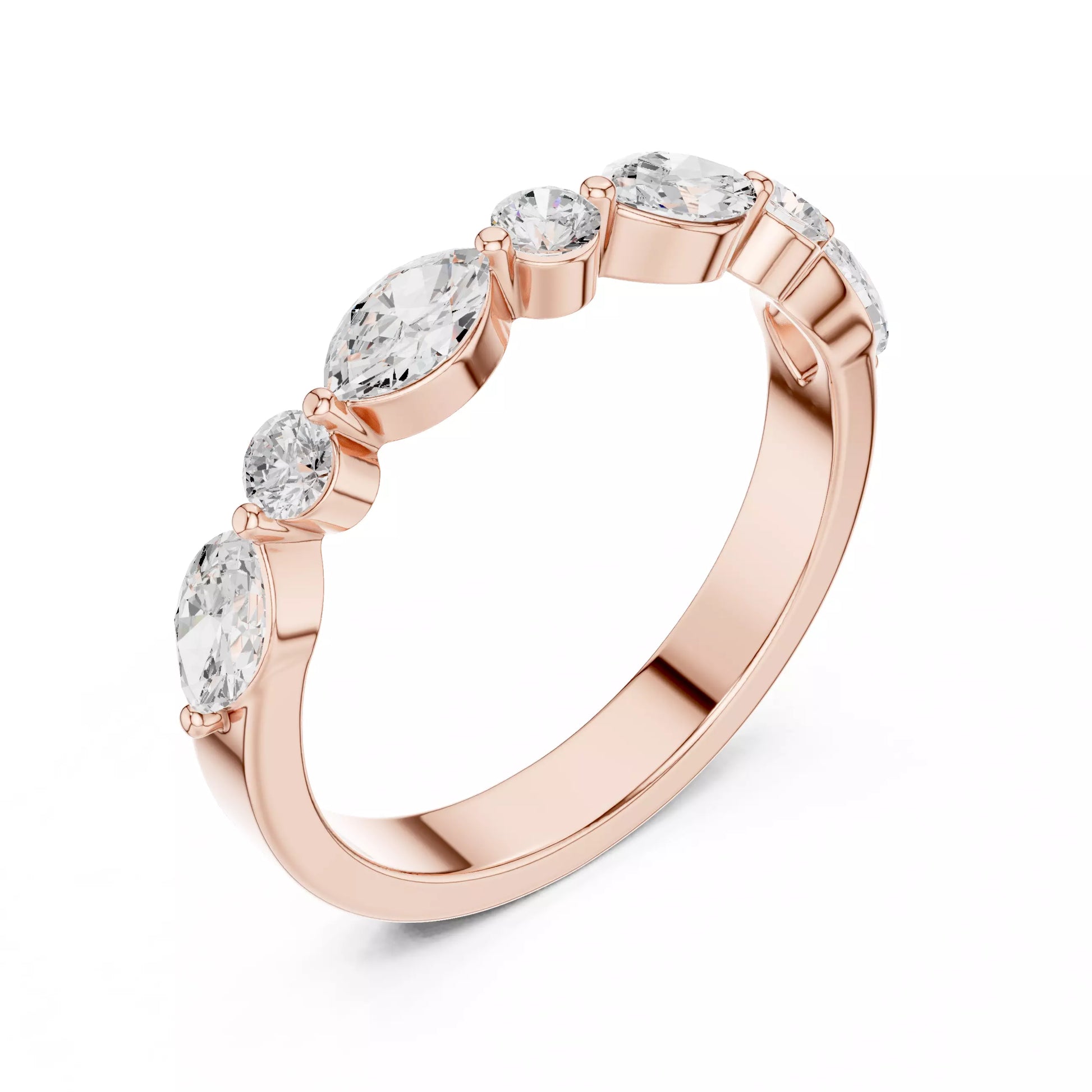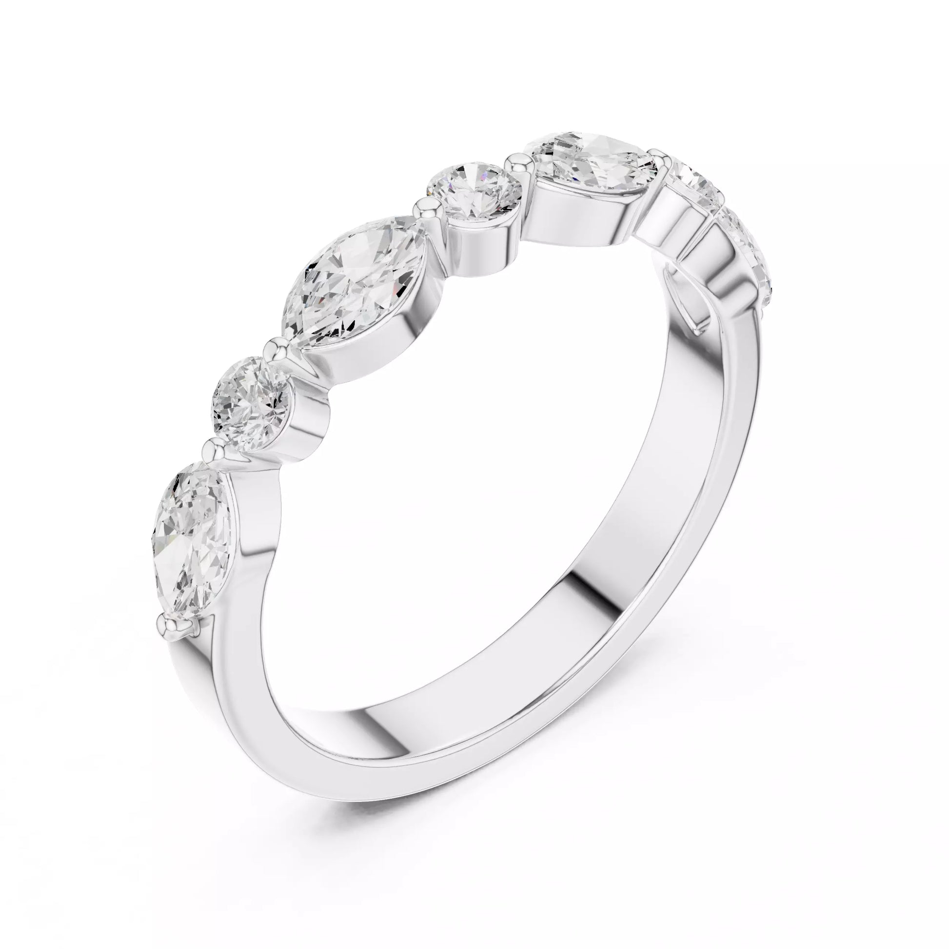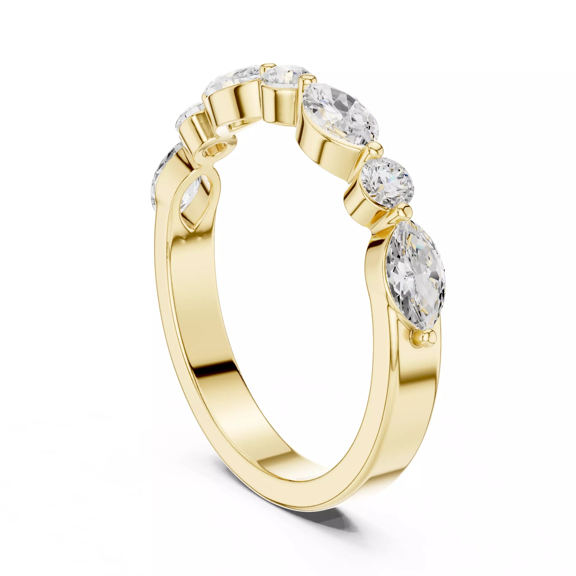 Esta pieza presenta un diseño de media churumbela con una arquitectura rítmica que alterna cortes redondos y cortes marquesa. El sistema de engaste es compartido con garras de botón, lo que permite una entrada de luz lateral óptima hacia los pabellones de las gemas. El cuerpo del anillo mantiene un espesor constante en la base de 1.60 mm y un ancho de 2.96 mm, proporcionando una estructura sólida capaz de soportar la tensión de las piedras sin deformarse. La altura de la cabeza es de 3.00 mm, lo que garantiza un perfil bajo y cómodo para el uso diario, minimizando enganches.