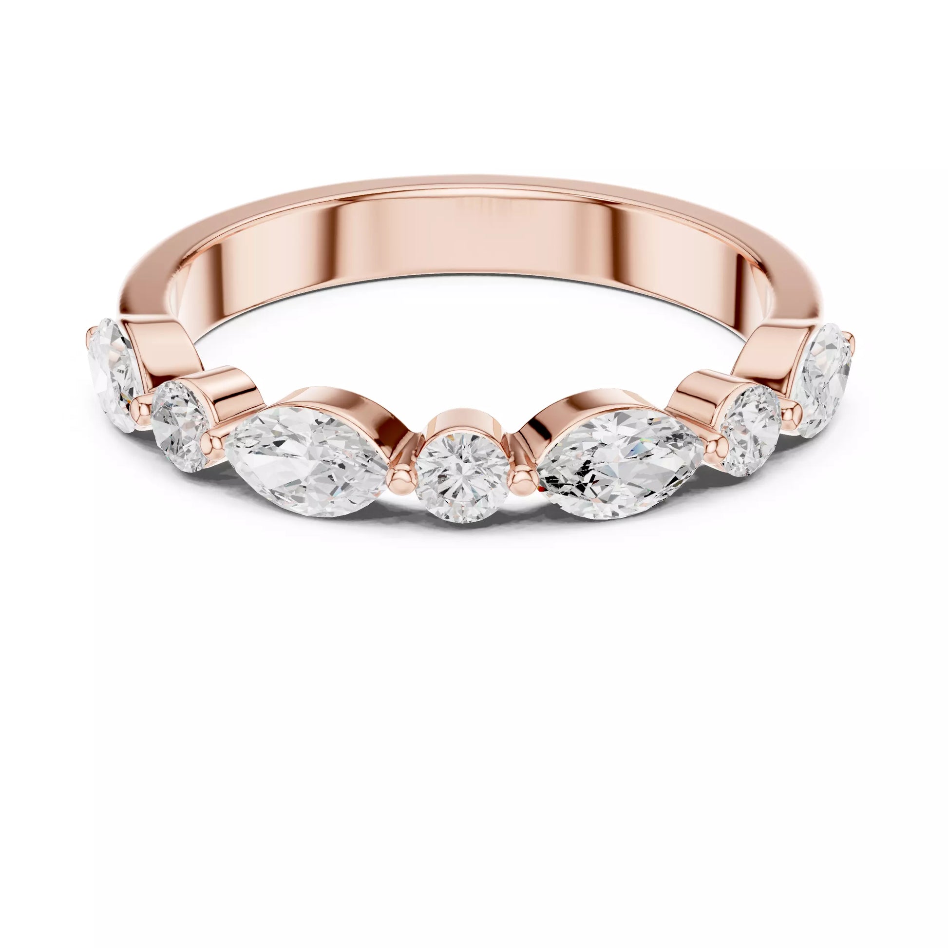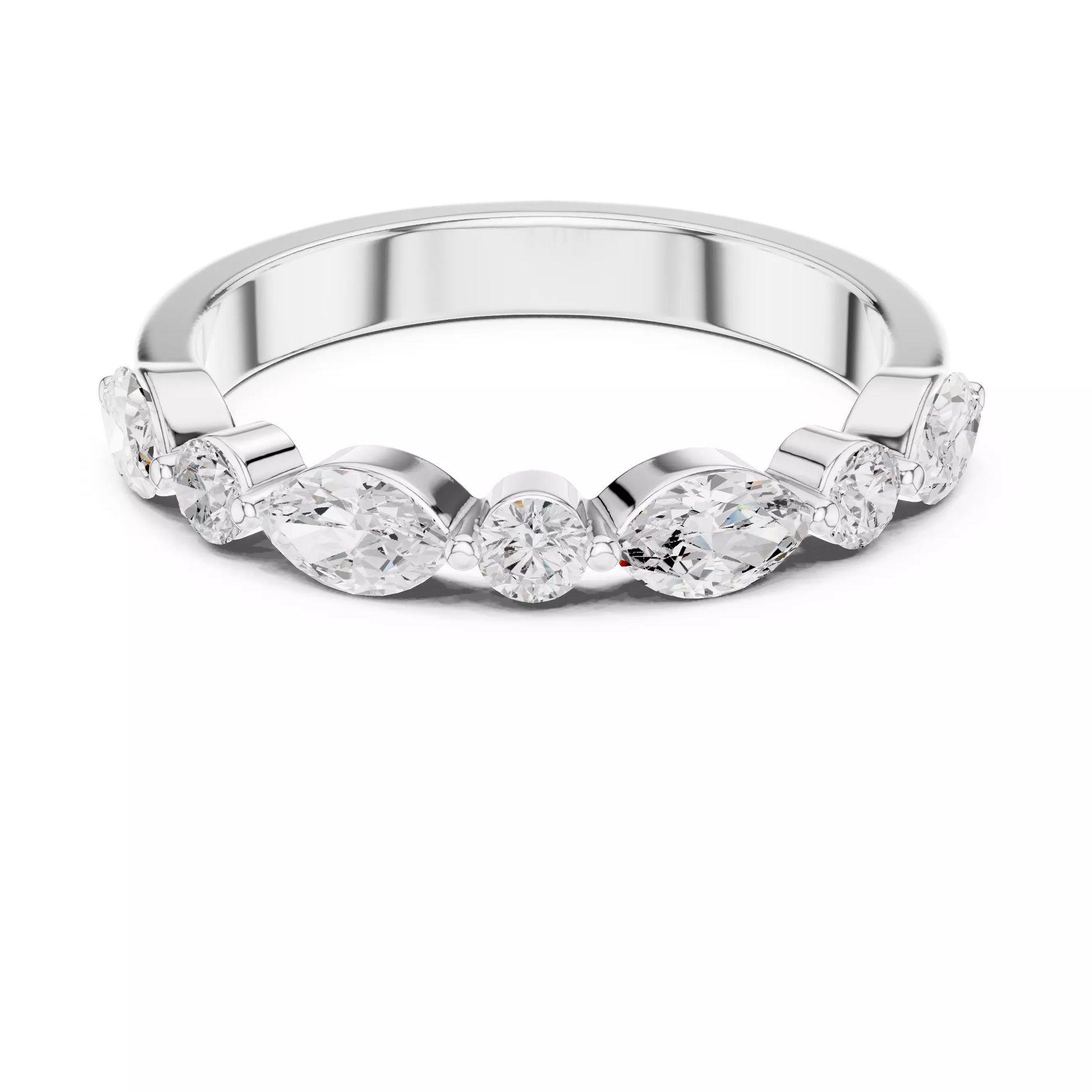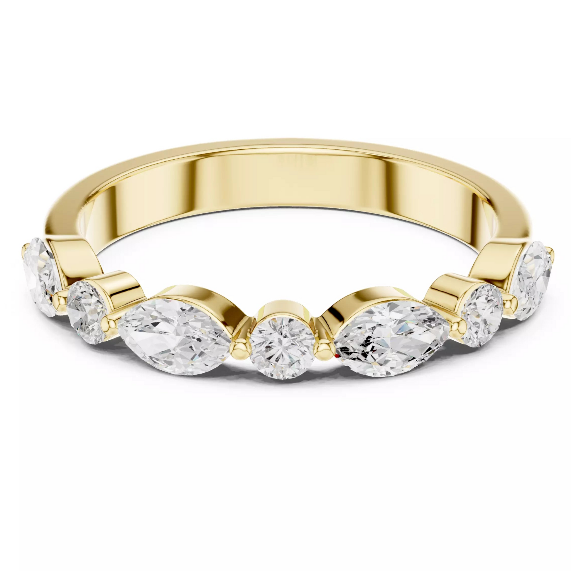 Esta pieza presenta un diseño de media churumbela con una arquitectura rítmica que alterna cortes redondos y cortes marquesa. El sistema de engaste es compartido con garras de botón, lo que permite una entrada de luz lateral óptima hacia los pabellones de las gemas. El cuerpo del anillo mantiene un espesor constante en la base de 1.60 mm y un ancho de 2.96 mm, proporcionando una estructura sólida capaz de soportar la tensión de las piedras sin deformarse. La altura de la cabeza es de 3.00 mm, lo que garantiza un perfil bajo y cómodo para el uso diario, minimizando enganches.