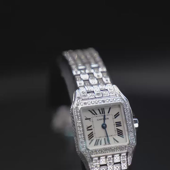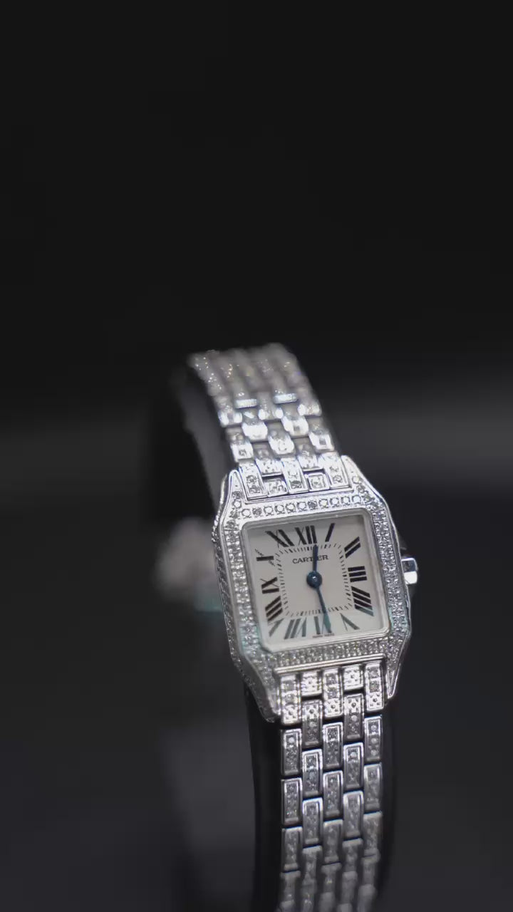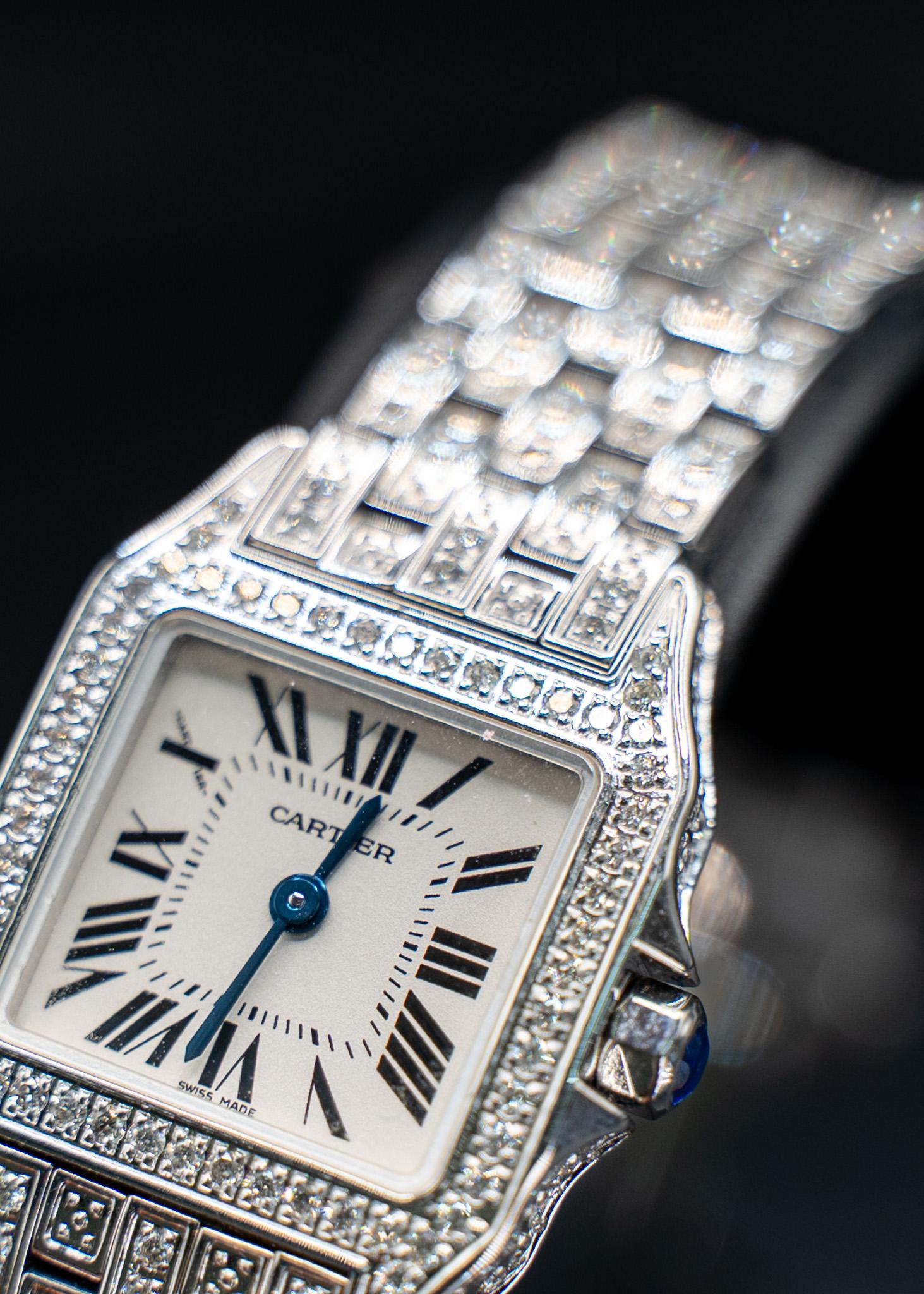 La pieza está completamente engastada en casa (aftermarket) con diamantes, desde la caja hasta el brazalete, lo que le confiere un brillo deslumbrante y un carácter inigualable. La esfera blanca con números romanos negros y agujas azuladas tipo espada mantiene el ADN clásico de la Maison, mientras que la corona, con cabujón azul, añade un detalle icónico de distinción.