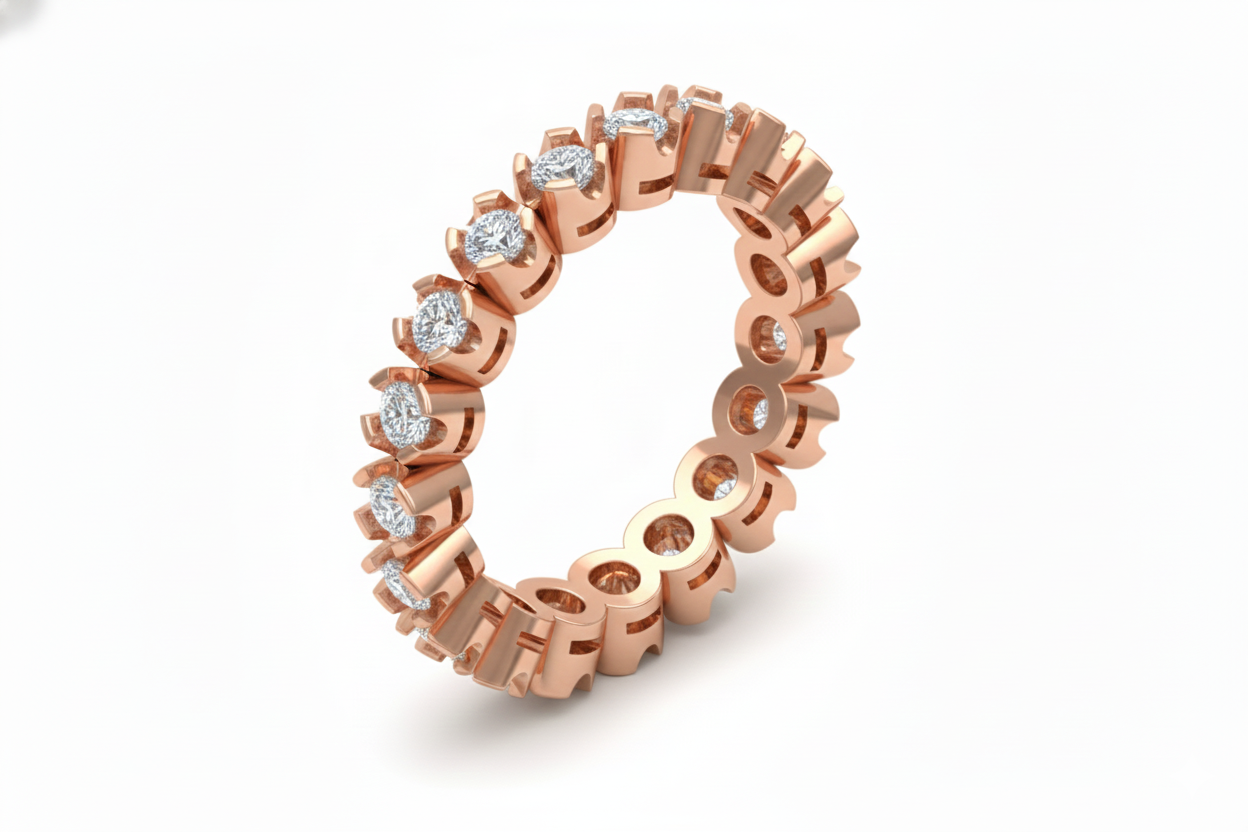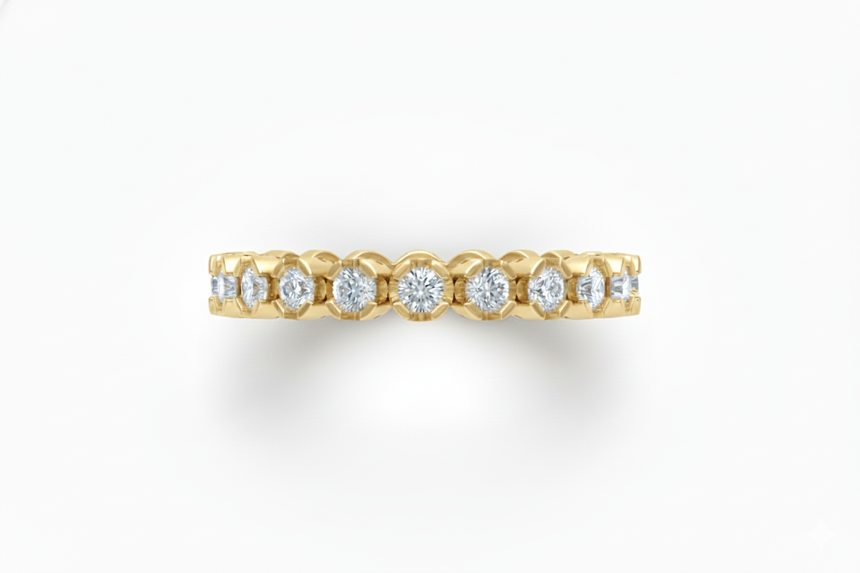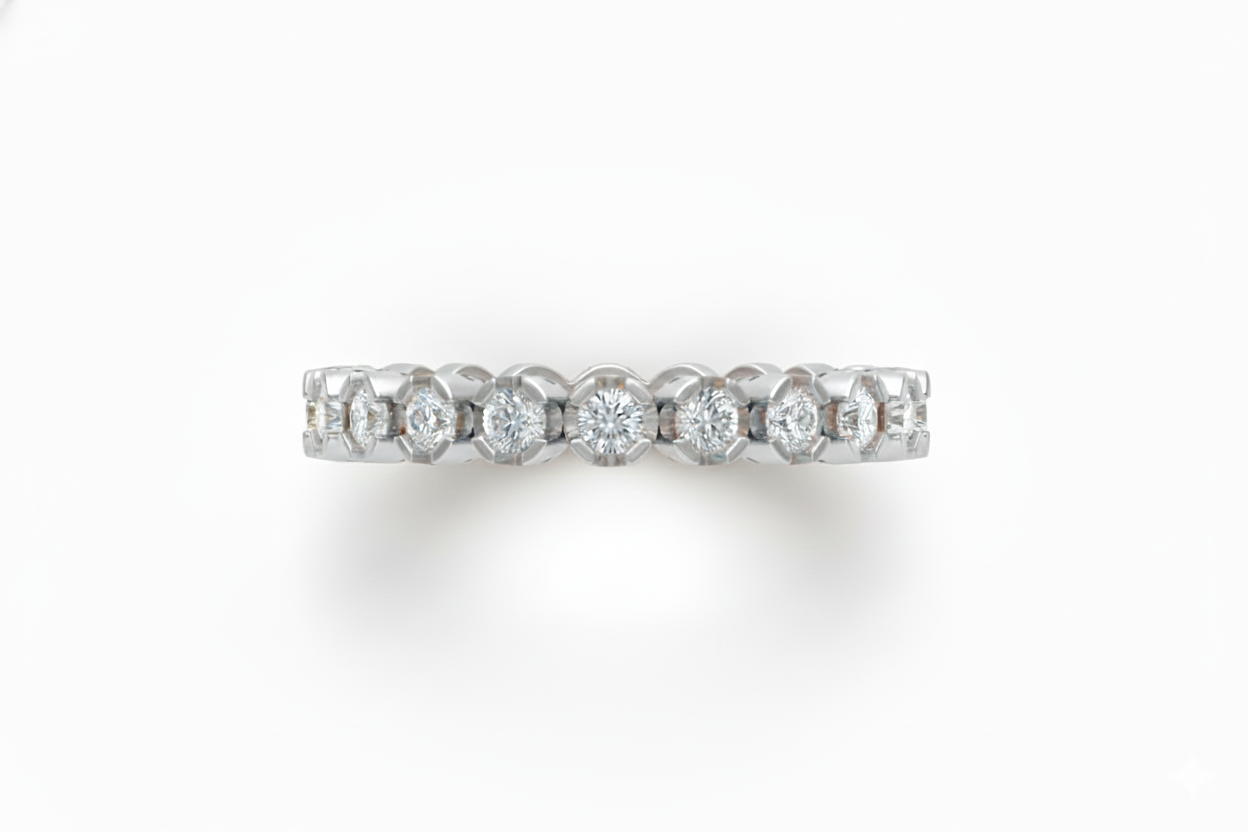 Pieza de arquitectura tipo churumbela completa o anillo sin fin con una estructura de galería abierta lateral. El diseño integra un total de 20 diamantes con un peso total de 0.60 ct distribuidos uniformemente a lo largo de la circunferencia del vástago. Las dimensiones estructurales son de 2.9 mm de ancho por 2.5 mm de espesor asegurando la integridad estructural necesaria para el uso diario.