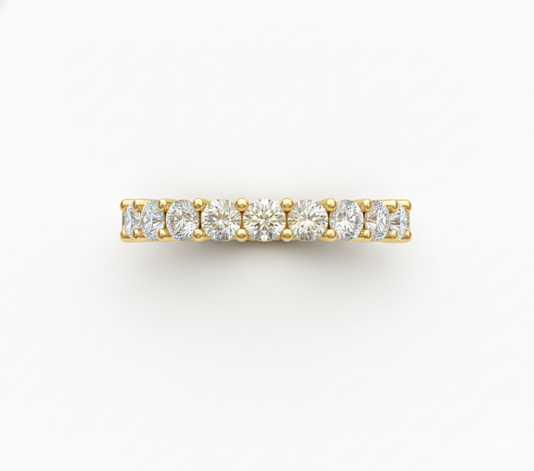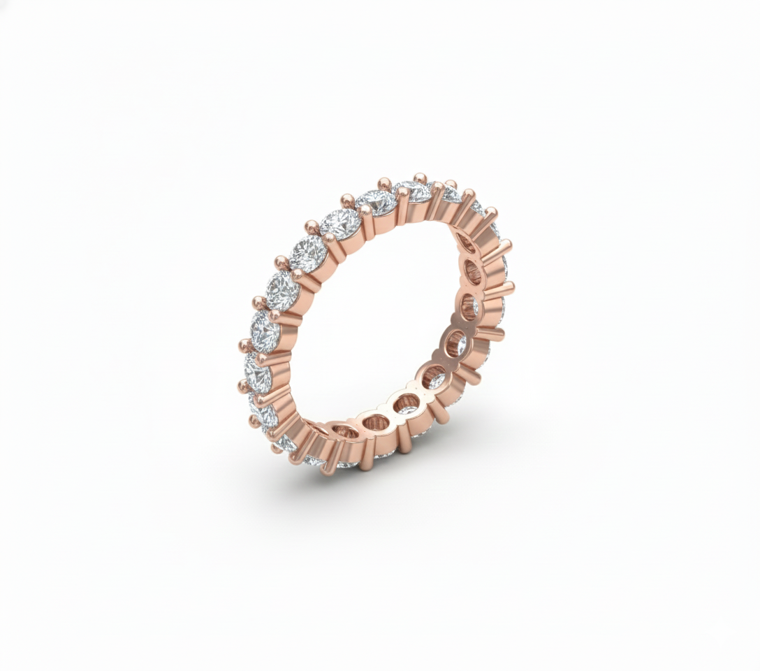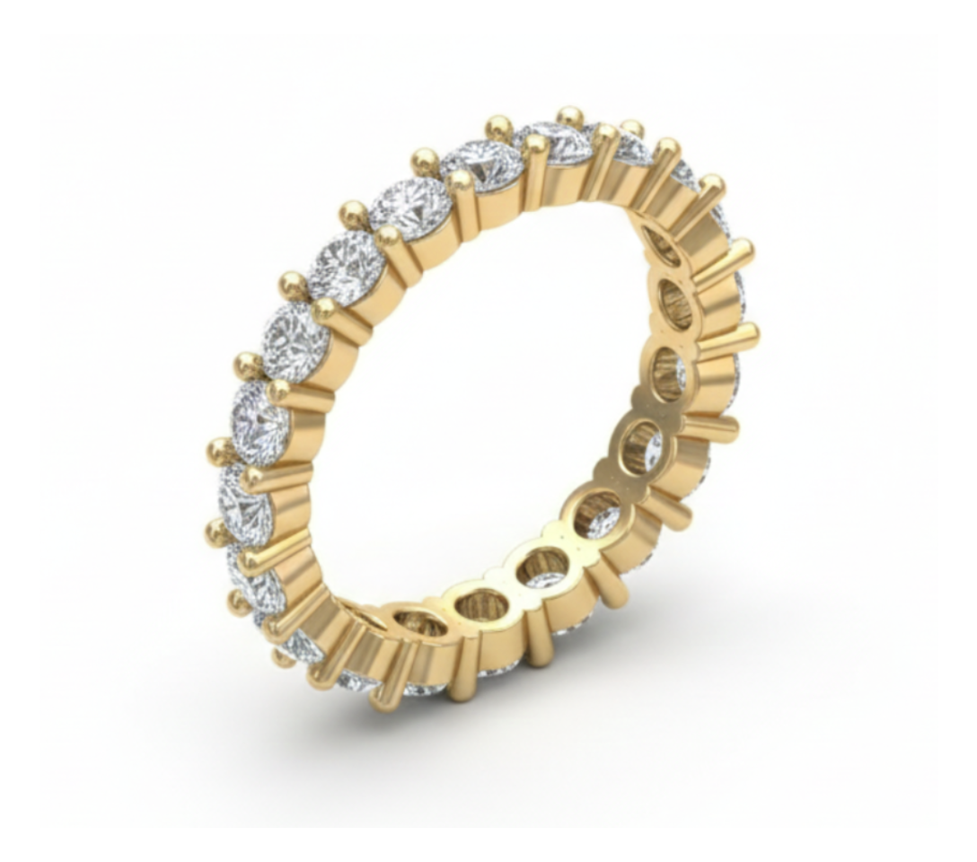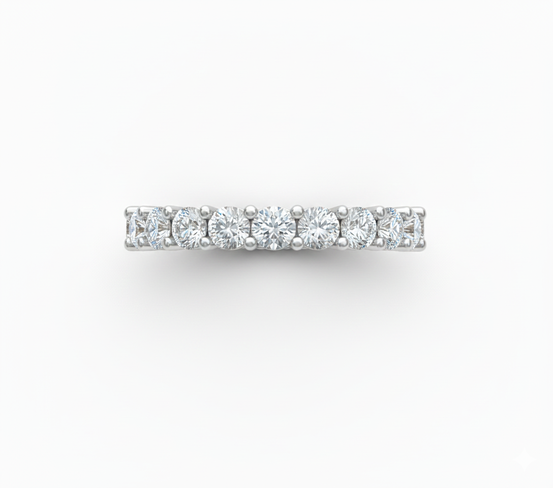 Esta pieza tipo Churumbela Eternity cuenta con un vástago de perfil recto continuo El diseño integra un total de 21 diamantes con un peso total acumulado de 2.10 ct, montados en engaste de uña compartida de dos puntos para minimizar la presencia de metal visual. La arquitectura presenta un ancho de banda de 3.1mm y un espesor de 2.3mm, garantizando solidez estructural sin comprometer la estética del anillo completo.