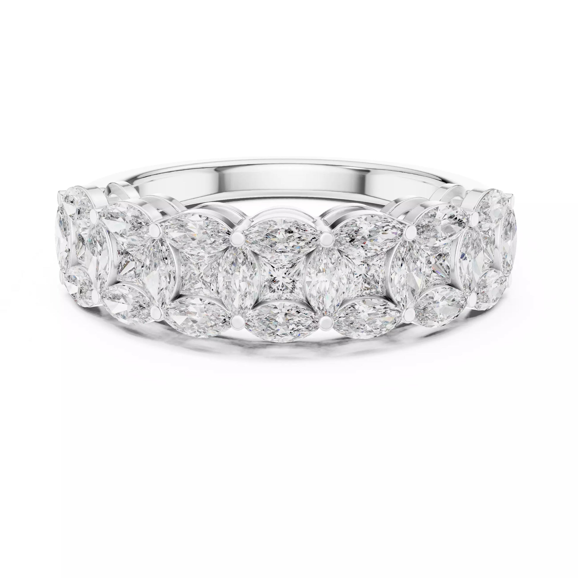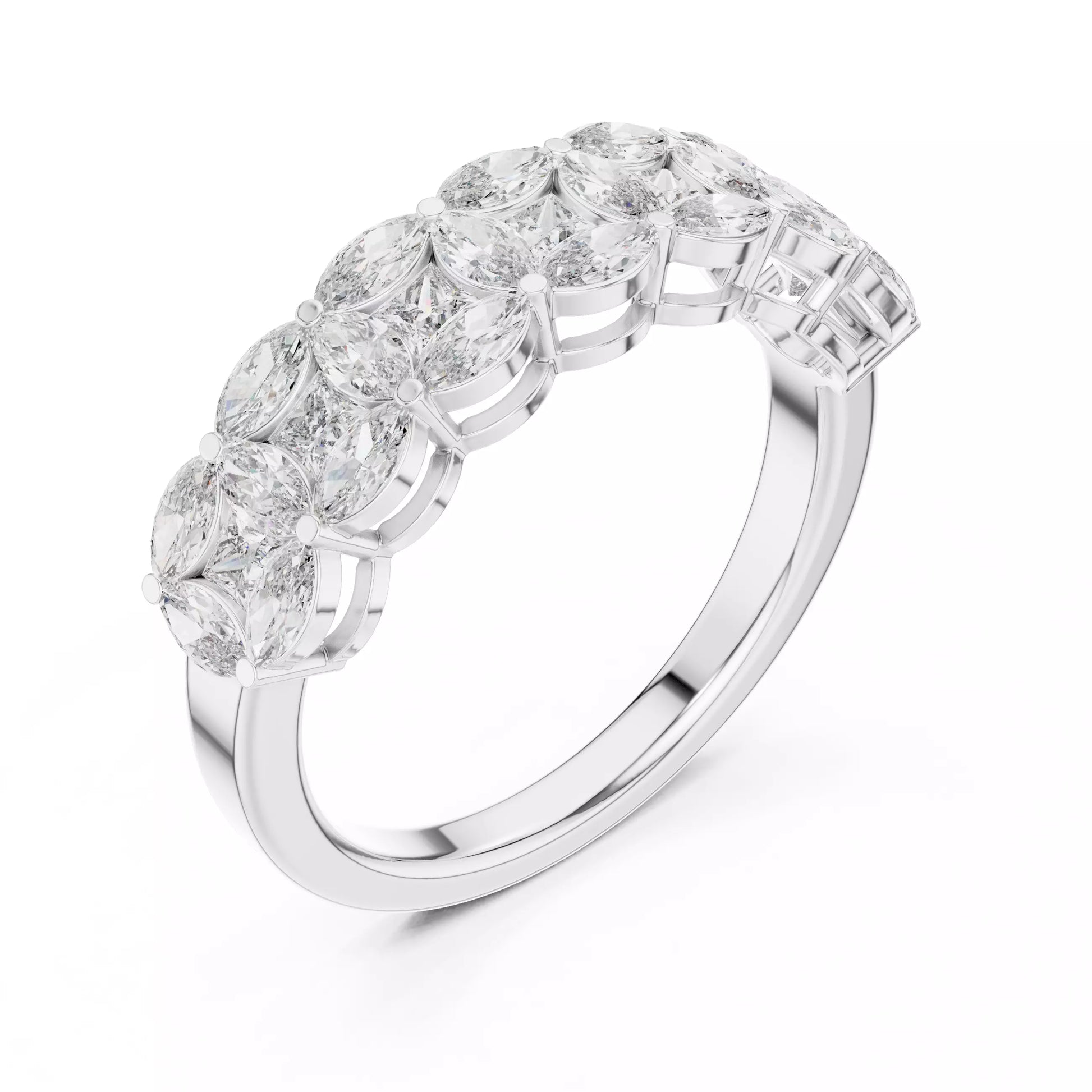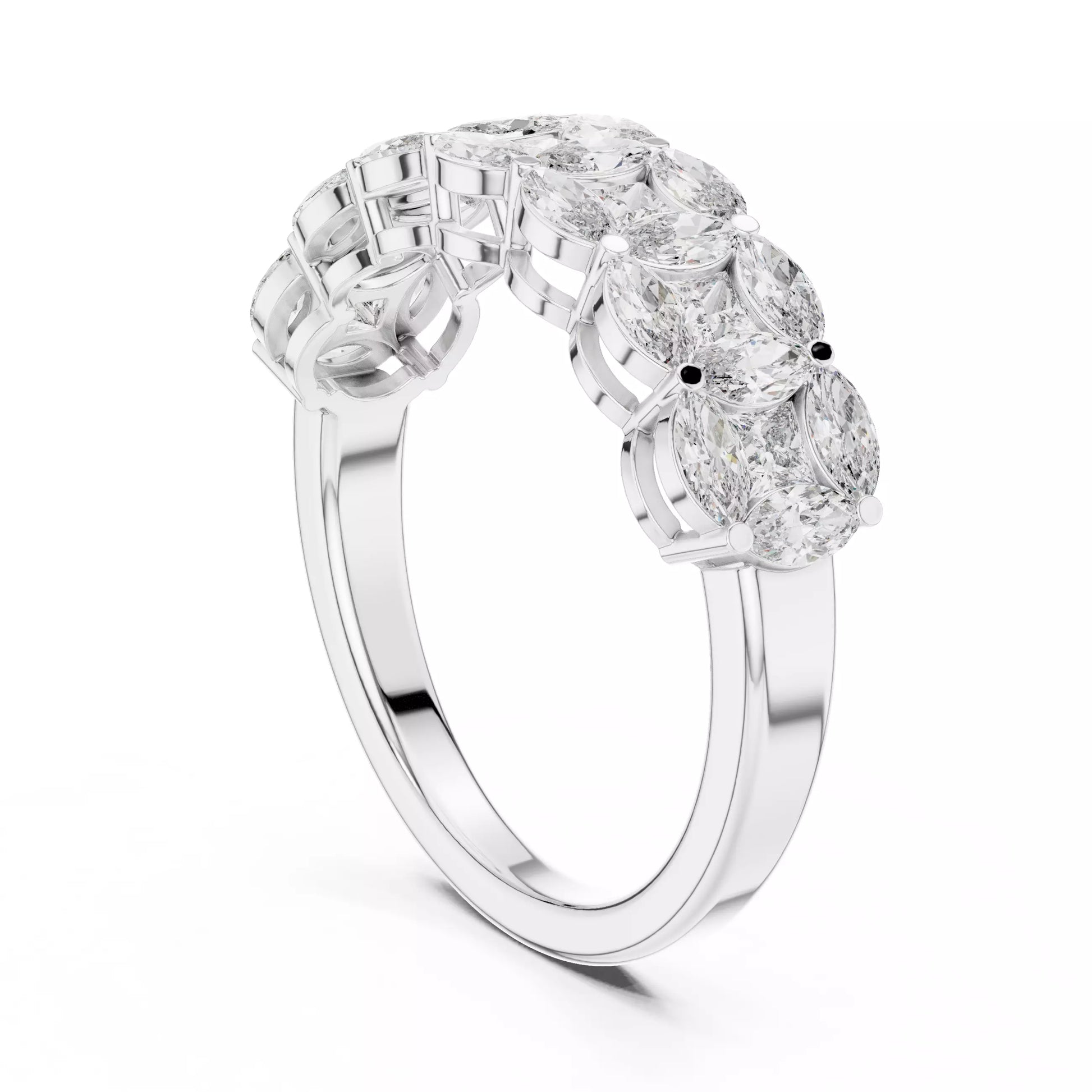 Esta pieza presenta una arquitectura de media eternidad con una curvatura orgánica tipo ola que recorre la parte superior del anillo. El riel tiene un espesor de 2.65 mm en la zona de engaste, lo cual es suficiente para alojar piedras de 2.00 mm con seguridad, dejando un margen de metal para el graneteado. El engaste es de granos compartidos, permitiendo una entrada de luz lateral óptima. El cuerpo del anillo se ensancha hacia la base hasta alcanzar los 2.5 mm, proporcionando un contrapeso sólido para evitar que el anillo gire en el dedo. El diámetro interno de 17.6 mm sugiere una talla estándar, y la estructura sólida bajo las piedras garantiza durabilidad ante el uso diario.