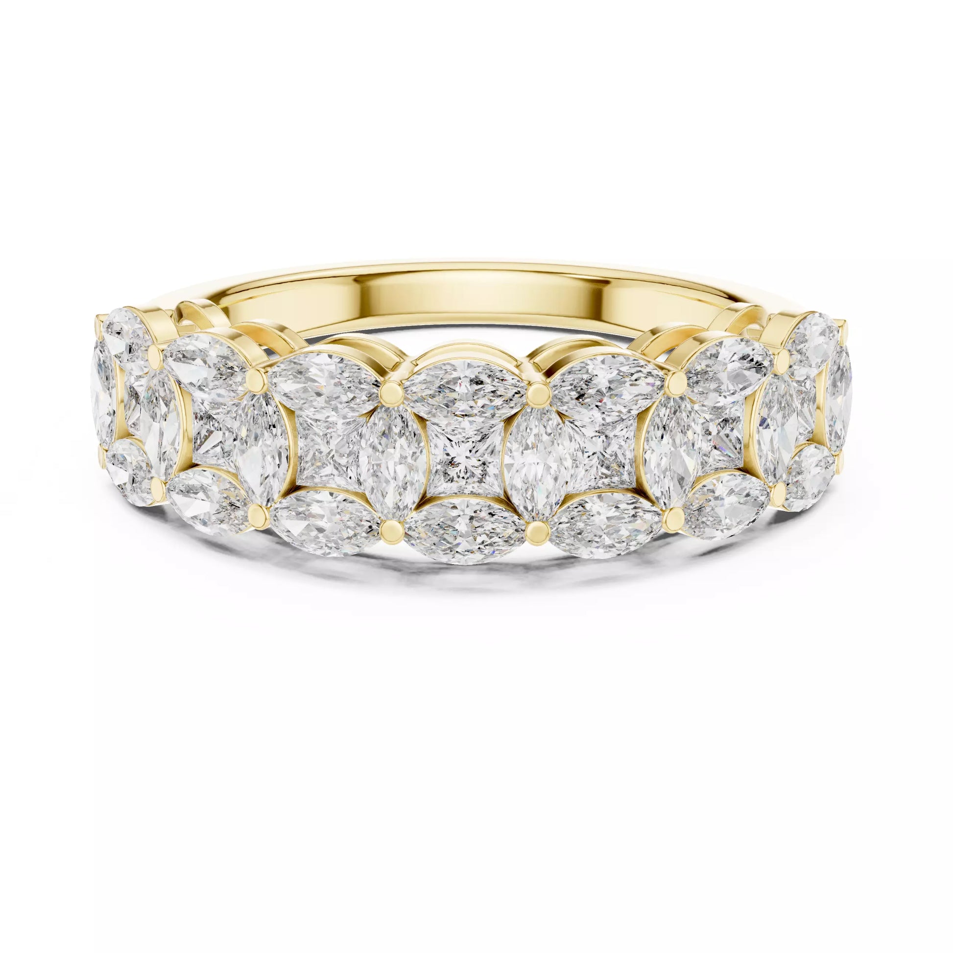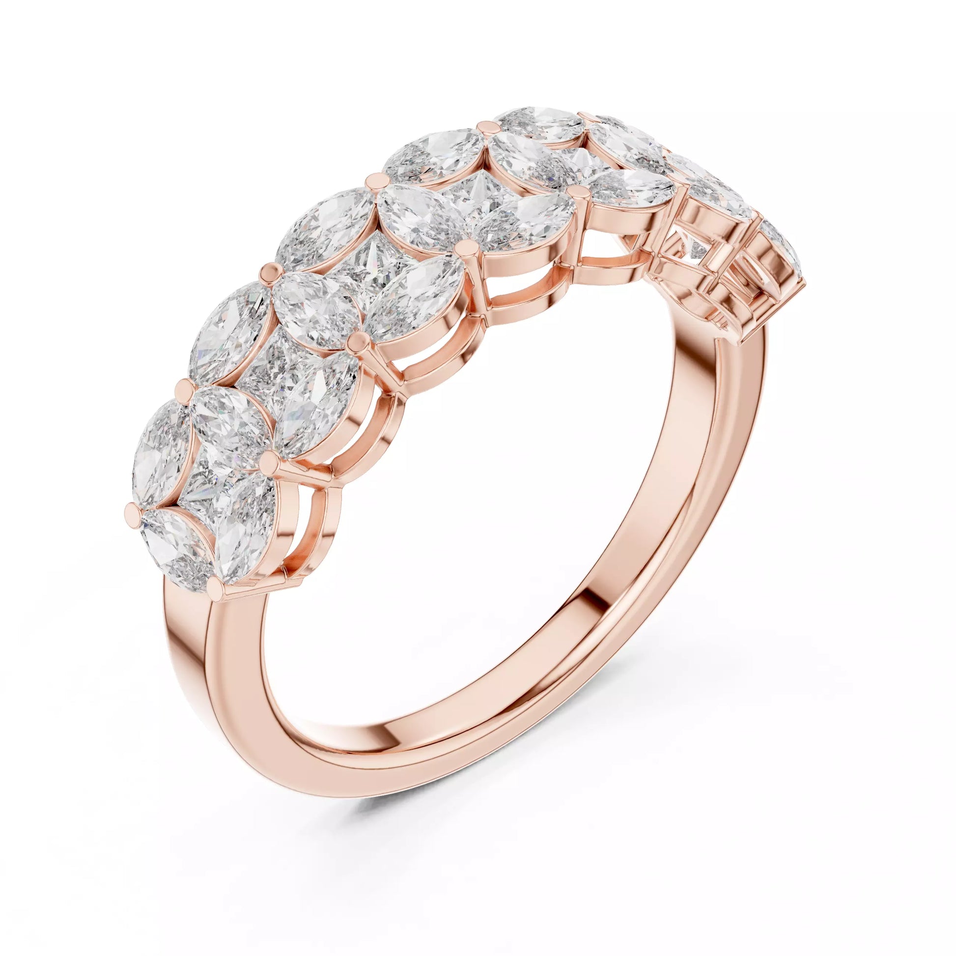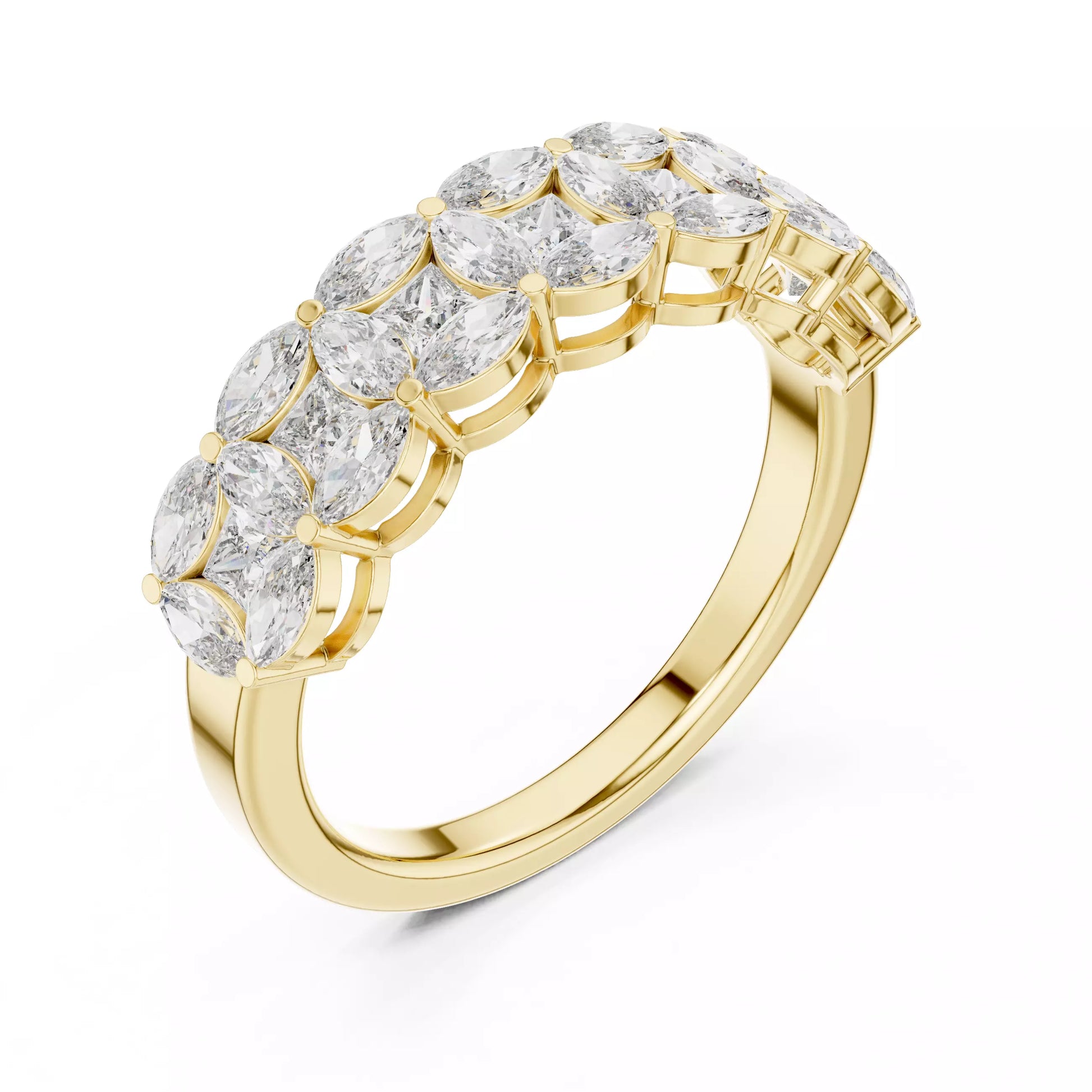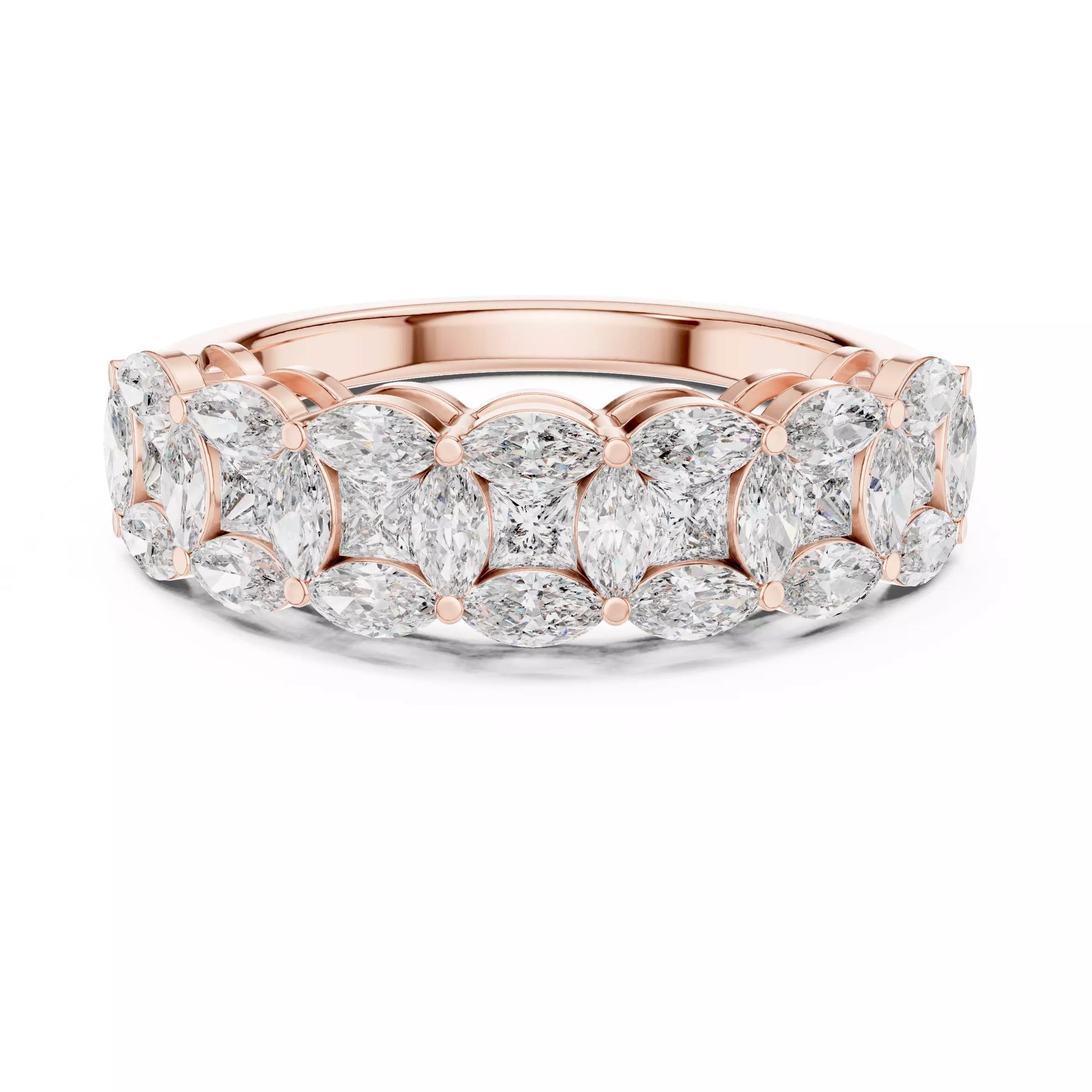 Esta pieza presenta una arquitectura de media eternidad con una curvatura orgánica tipo ola que recorre la parte superior del anillo. El riel tiene un espesor de 2.65 mm en la zona de engaste, lo cual es suficiente para alojar piedras de 2.00 mm con seguridad, dejando un margen de metal para el graneteado. El engaste es de granos compartidos, permitiendo una entrada de luz lateral óptima. El cuerpo del anillo se ensancha hacia la base hasta alcanzar los 2.5 mm, proporcionando un contrapeso sólido para evitar que el anillo gire en el dedo. El diámetro interno de 17.6 mm sugiere una talla estándar, y la estructura sólida bajo las piedras garantiza durabilidad ante el uso diario.
