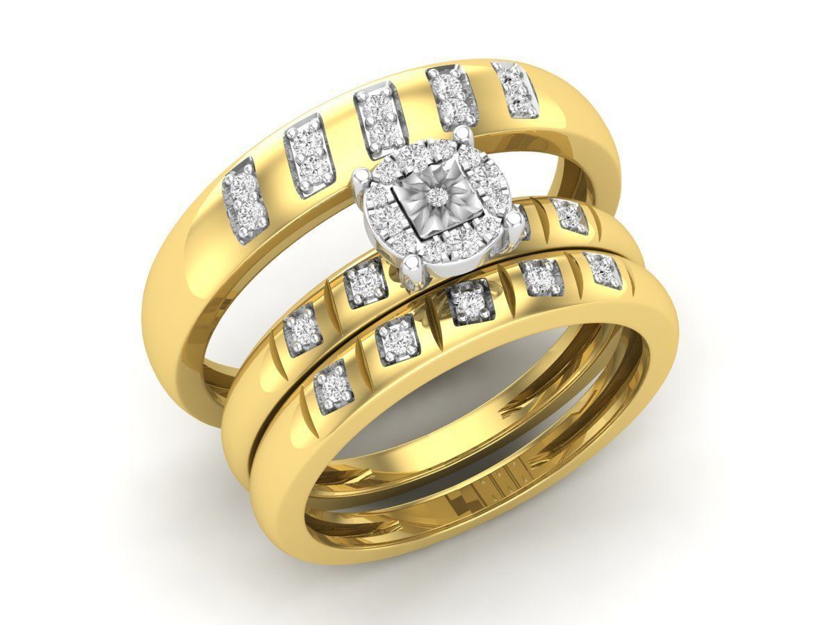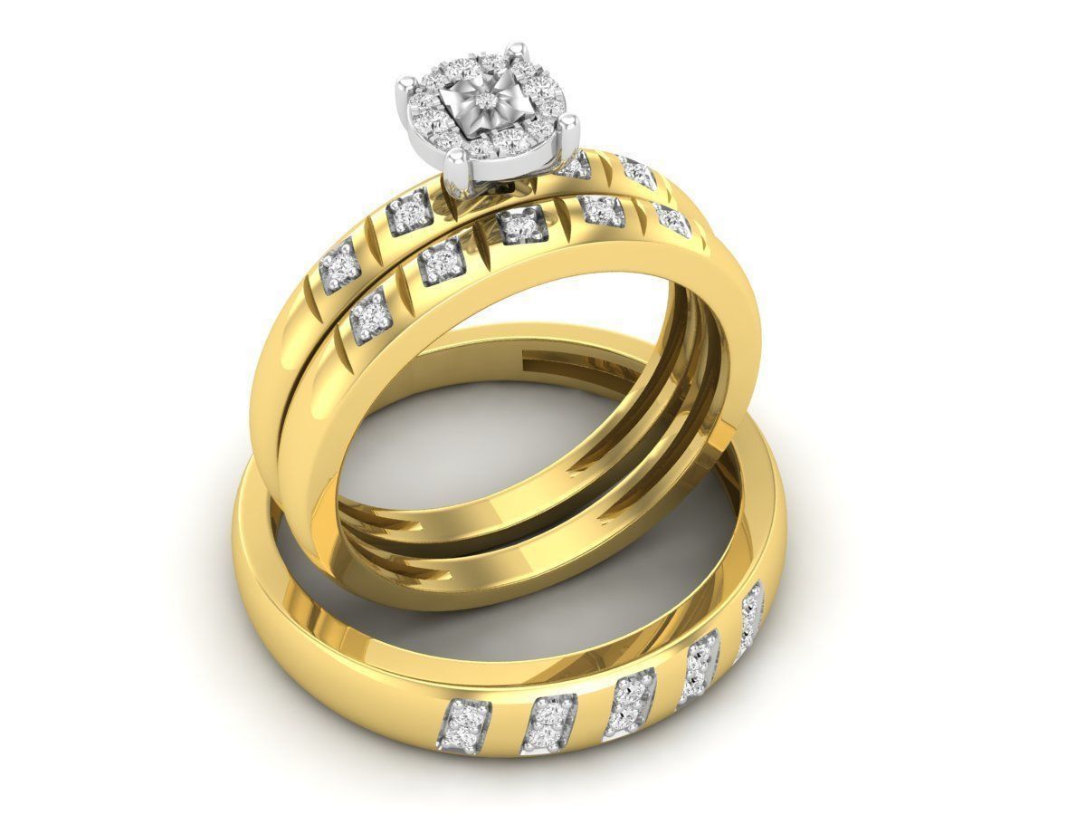 Trio de argollas matrimoniales vienen en un conjunto de tres con un solitario circular de centro cuadrado. Diseñadas con elegancia, estas argollas son perfectas para simbolizar el amor duradero y la unión. Hechas con materiales de alta calidad, son un recordatorio eterno de su amor.