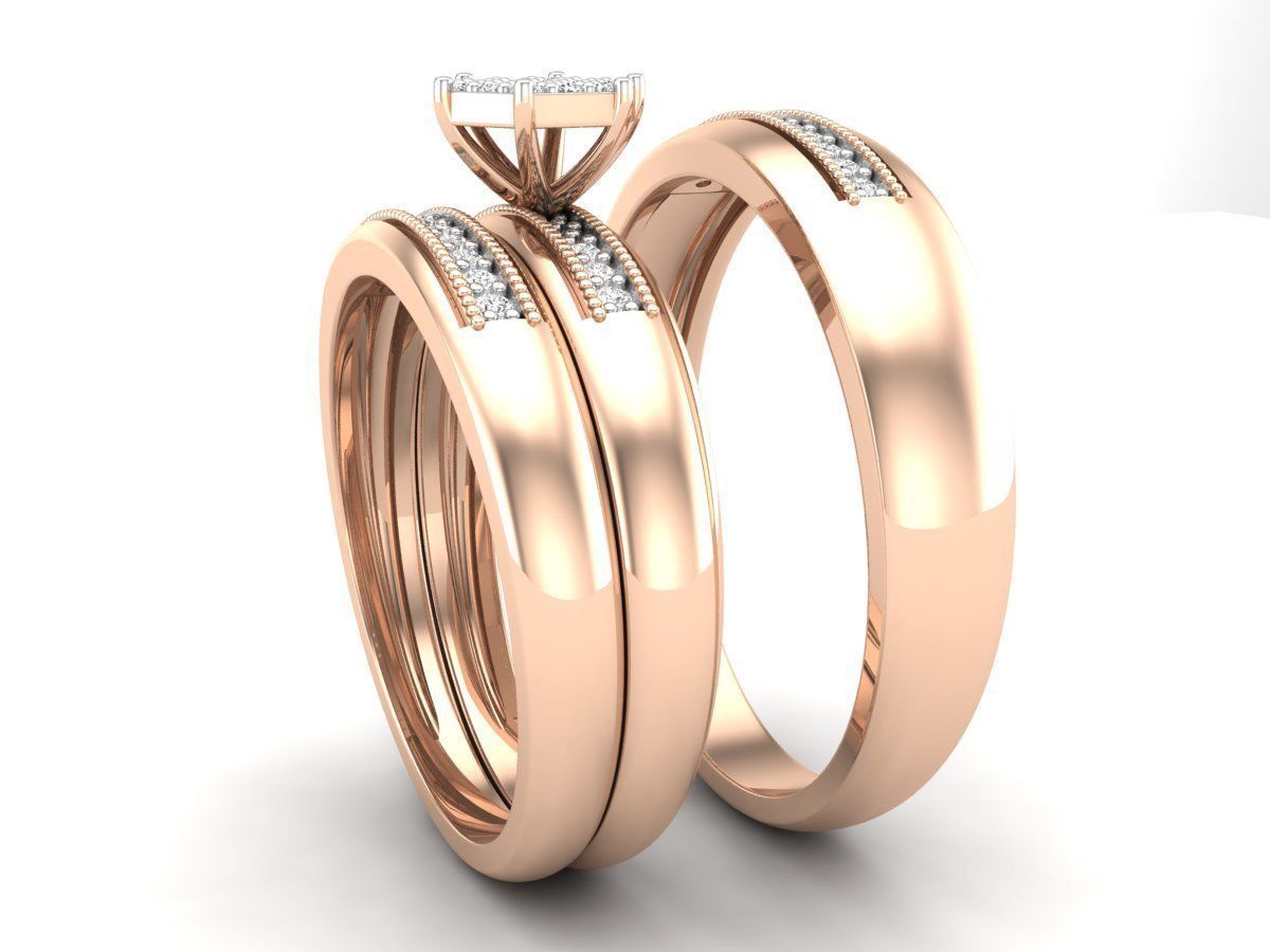 Trio de Argollas Matrimoniales con 47 Incrustaciones repartidas en sus tres argollas. Con un diseño romántico y sofisticado, cada argolla cuenta con hermosas incrustaciones al gusto para simbolizar la eternidad del amor. Celebra tu unión con este set exclusivo que representa la belleza de tu relación.